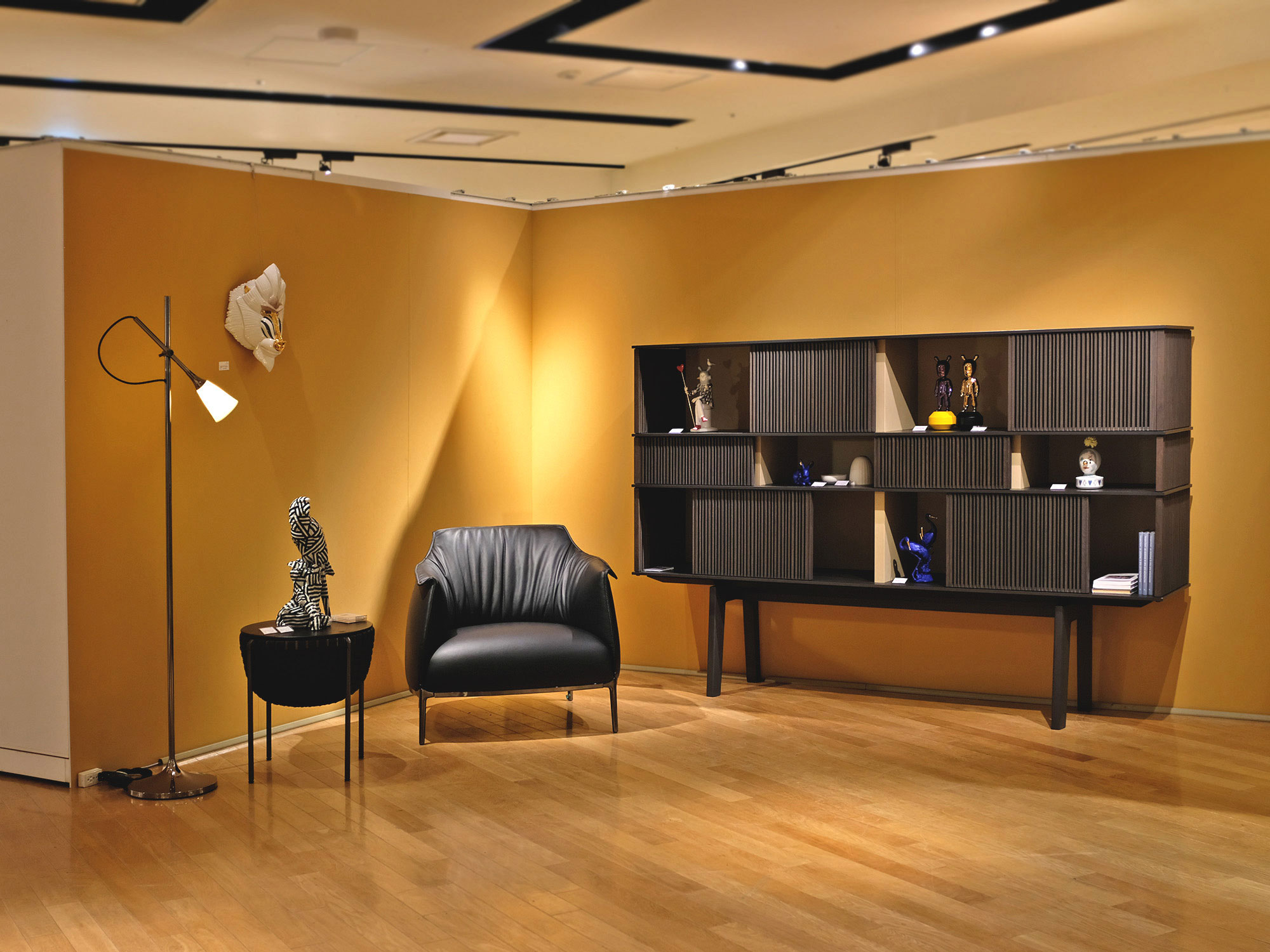 2021年コロナ禍真っ只中。いかに楽しくステイホームを過ごすかは人々の関心ごとの一つ。ともすれば退屈ないつもの風景、そこに新しい風を吹き込むようなパワフルでアーティスティックなリヤドロのポーセリン達。その溢れ出すパワーがインテリアにも拡散し、心踊る日常を提案するというコンセプトを草案。作品からインスパイアされたカラーやデザインの什器を織り交ぜ、作品のパワーが会場の人々に伝染するような空間を試みた。
